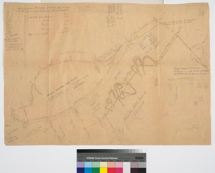Bound volume: Rancho La Sierra, Partition 1876-1877. Showing courses, distances, acreage [lots of cross-outs]; colored pencil Writing on verso. Title supplied by cataloger.