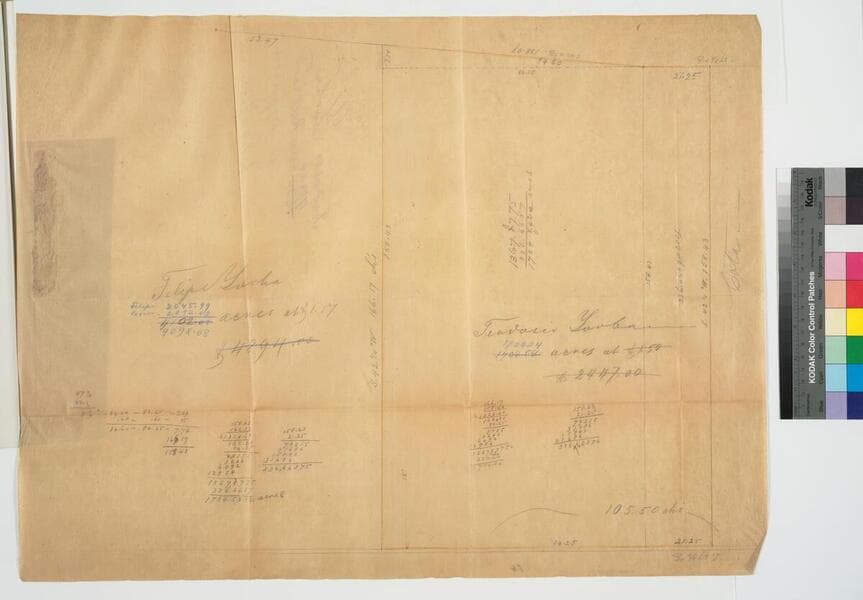Bound volume: Rancho La Sierra, Partition 1876-1877. Colored pencil; showing acreage, courses, distances, structures, surface detail; calculations Verso: sketch & writing. Title supplied by cataloger.