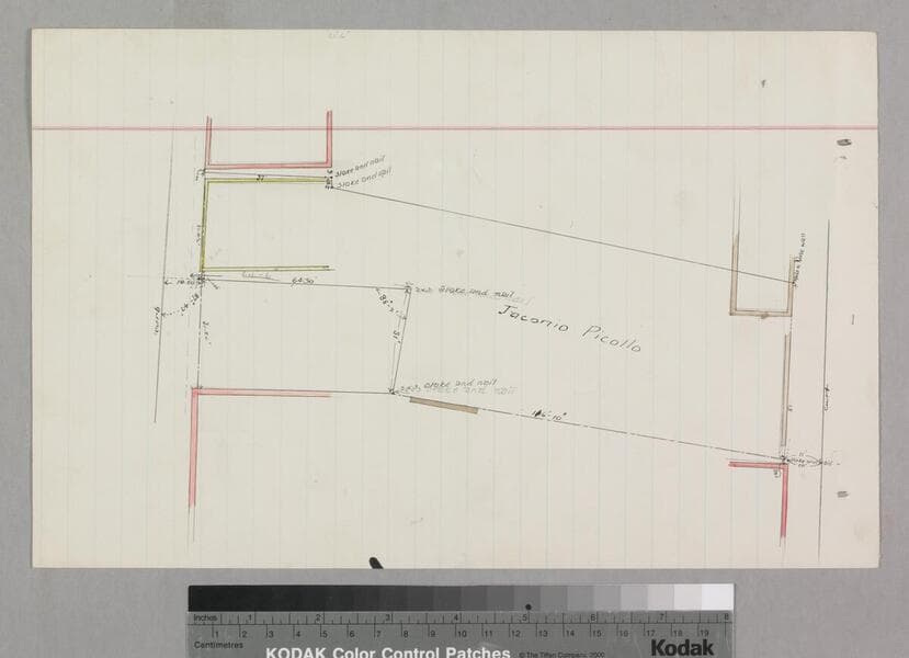 P. 8 of fastened document, "Luis Wilhart Tract," original survey Feb 6, 1882; showing courses, distances, acreage, Chavez Street; parcel west of Los Angeles River, along Downey Avenue; calculations, stakes & markers. Copied by Alfred Solano.. Title supplied by cataloger.