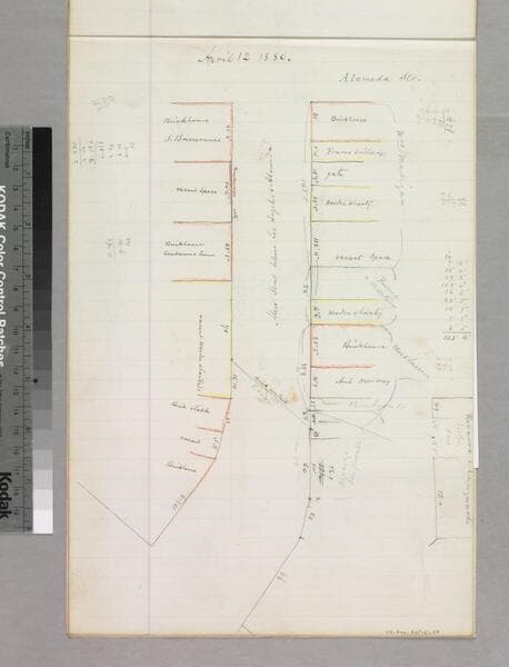 Within bound document, "Aliso Street Sewer," verso of pg. 5, pencil on paper, showing parcels, distances. Title supplied by cataloger.