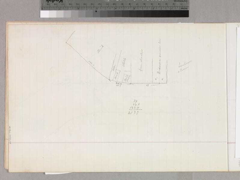 Within bound document, "Aliso Street Sewer," verso of pg. 2, bottom of pg. 3 (below conduit), verso of pg. 3 (color highlighting, courses, distances, parcel owners), recto & verso of pg. 4 showing courses, distances in pencil. Title supplied by cataloger.