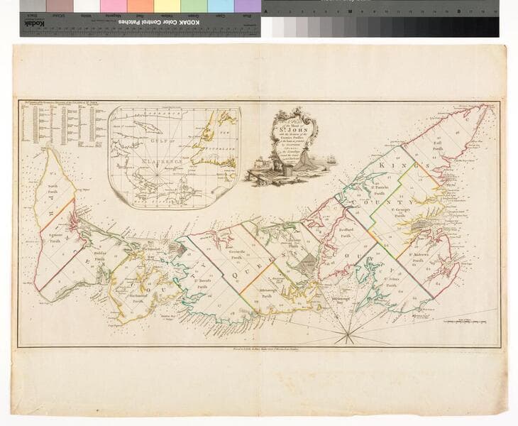 This map follows 105:754 in production. A list of Lots with Proprietor's names is added and the map title moved. Submap: Gulf of St. Laurence. Table: the Contents of the Respective Divisions of the Island of St. John. A list of Lots and Proprietor's Names.. "divided into Counties & Parishes and the Lots as granted by Government to which are added the Soundings round the Coast and Harbours Improved from the late Survey of Captain Holland. Published as the Act directs April 6, 1775." Prime meridian: London. Relief: no. Graphic Scale: Miles. Projection: Plane. Watermark: Crowned fleur-di-lis WF. Printing Process: Copper engraving. Verso Text: MS notes: 755.