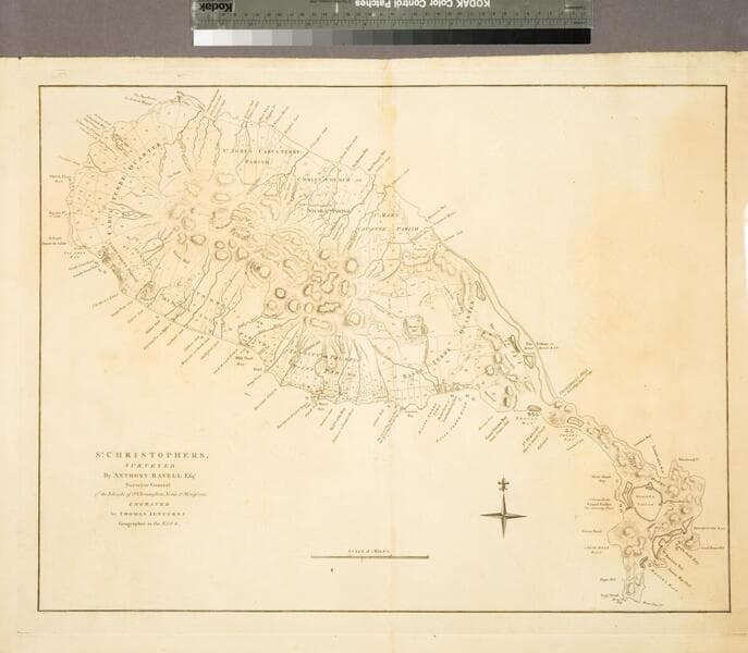 St. Christophers, or St. Kitts, surveyed By Anthony Ravell Esqr. Surveyor General of the Islands of St. Christophers, Nevis, & Montserrat. Engraved by Thomas Jefferys Geographer to the King