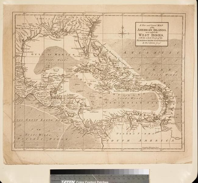 A New and Correct Map of the American Islands, now called the West Indies, with the whole Coast of the Neighbouring Continent. By Thos. Kitchin Geogr
