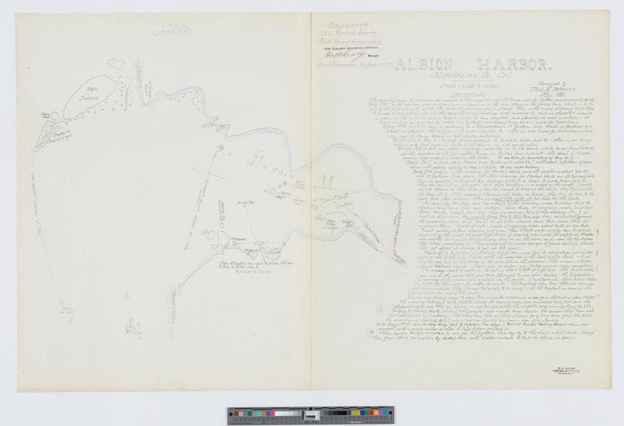 One of a series of 35 charts of small California harbors. The maps are hand tinted and include notes on the harbor conditions for ships. From the library of John Haskell Kemble. "Presented to U. S. Coast Survey with compliments of New Zealand Insurance Company ... San Francisco 23 Jany. 1886." "E. A. Dakin, Electric Pen Printer, 320 Sansome St." Previously identified as 479297p. Coordinates based on the location of Mendocino Bay (USGS ID 228497).
