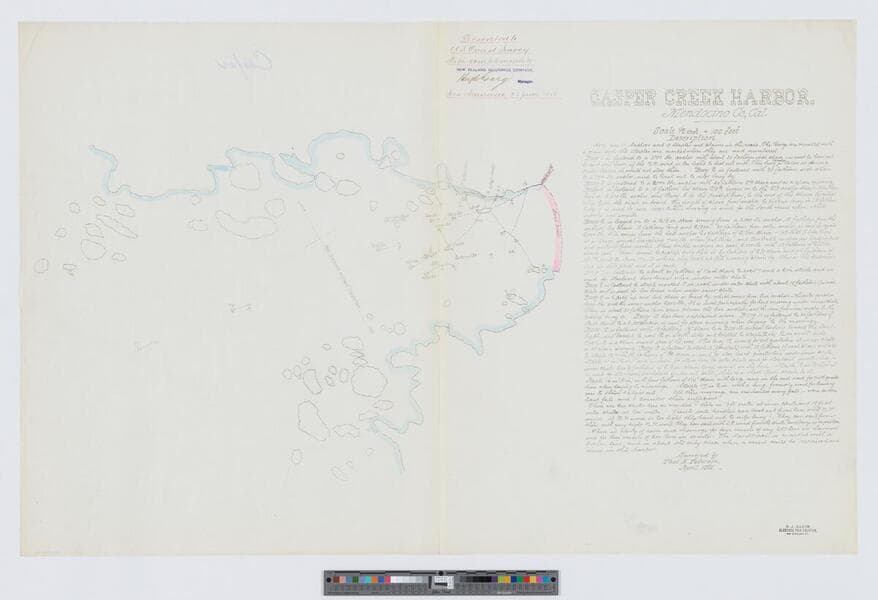 One of a series of 35 charts of small California harbors. The maps are hand tinted and include notes on the harbor conditions for ships. From the library of John Haskell Kemble. "Presented to U. S. Coast Survey with compliments of New Zealand Insurance Company ... San Francisco 23 Jany. 1886." "E. A. Dakin, Electric Pen Printer, 320 Sansome St." Previously identified as 479297p. Coordinates based on the location of Mendocino Bay (USGS ID 228497).