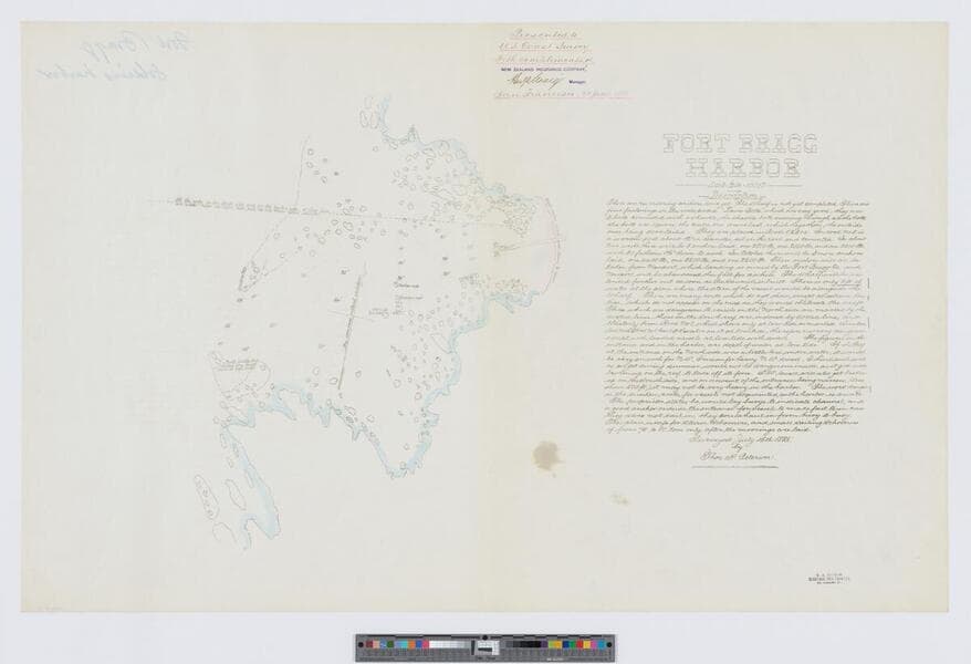 One of a series of 35 charts of small California harbors. The maps are hand tinted and include notes on the harbor conditions for ships. From the library of John Haskell Kemble. "Presented to U. S. Coast Survey with compliments of New Zealand Insurance Company ... San Francisco, 23 Jany. 1886." "E. A. Dakin, Electric Pen Printer, 320 Sansome St." Previously identified as 479297aa. Coordinates based on the location of Noyo Bay (USGS ID 229807).