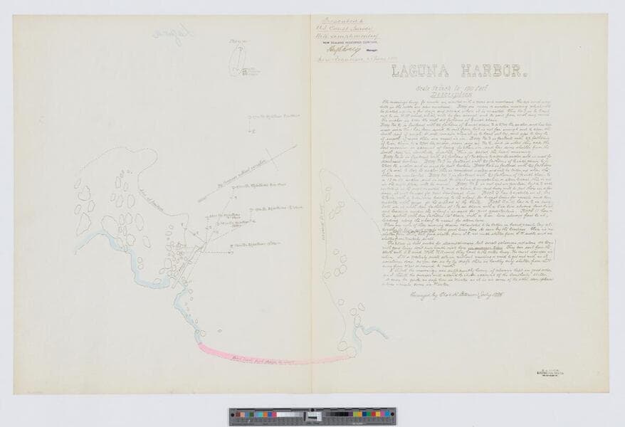 One of a series of 35 charts of small California harbors. The maps are hand tinted and include notes on the harbor conditions for ships. From the library of John Haskell Kemble. "Presented to U. S. Coast Survey with compliments of New Zealand Insurance Company ... San Francisco, 23 Jany, 1886." "E. A. Dakin, Electric Pen Printer, 320 Sansome St." Previously identified as 479297ff. Coordinates based on the location of Whitesboro Cove (USGS ID 255234).