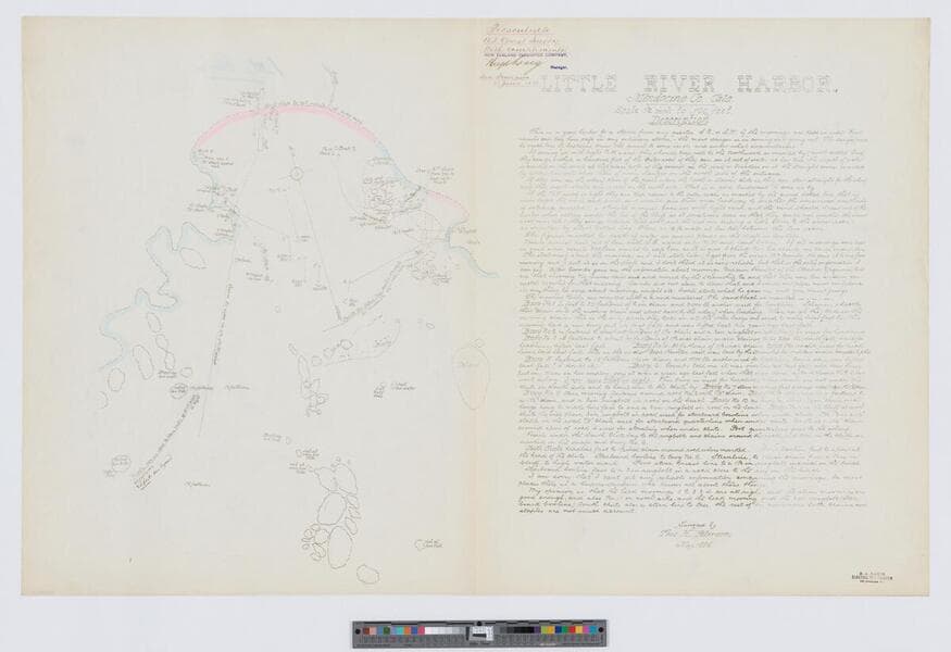 One of a series of 35 charts of small California harbors. The maps are hand tinted and include notes on the harbor conditions for ships. From the library of John Haskell Kemble. "Presented to U. S. Coast Survey with compliments of New Zealand Insurance Company ... San Francisco, 23 Jany, 1886." "E. A. Dakin, Electric Pen Printer, 320 Sansome St." Previously identified as 479297ff. Coordinates based on the location of Whitesboro Cove (USGS ID 255234).