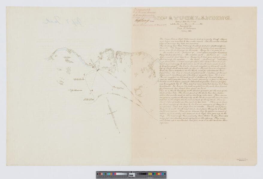One of a series of 35 charts of small California harbors. The maps are hand tinted and include notes on the harbor conditions for ships. From the library of John Haskell Kemble. "Presented to U. S. Coast Survey with compliments of New Zealand Insurance Company ... San Francisco, Jan. 23, 1886." "E. A. Dakin, Electric Pen Printer, 320 Sansome St." Previously identified as 479297y. Coordinates based on the location of Fisk Mill Cove (USGS ID 223554).
