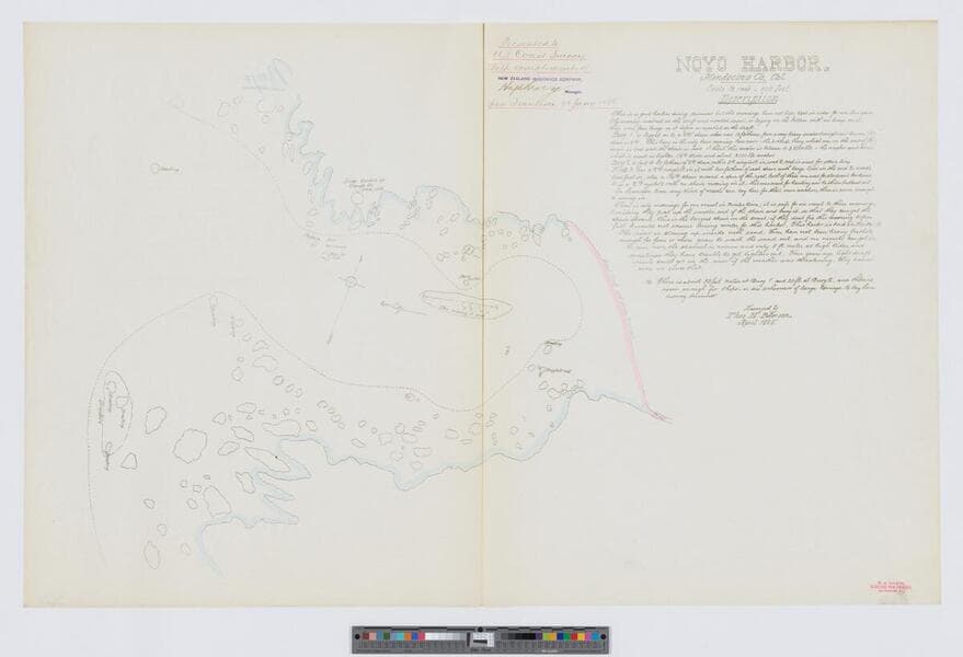 One of a series of 35 charts of small California harbors. The maps are hand tinted and include notes on the harbor conditions for ships. From the library of John Haskell Kemble. "Presented to U. S. Coast Survey with compliments of New Zealand Insurance Company ... San Francisco 23 Jany. 1886." "E. A. Dakin, Electric Pen Printer, 320 Sansome St." Previously identified as 479297p. Coordinates based on the location of Mendocino Bay (USGS ID 228497).