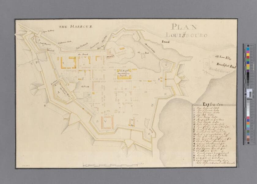 Manuscript plan showing the defensive batteries around Halifax about 6 years after the first European settled there. Shows the layout of the town, the Governor's house, store, ordinance and market buildings and the King's wharf.