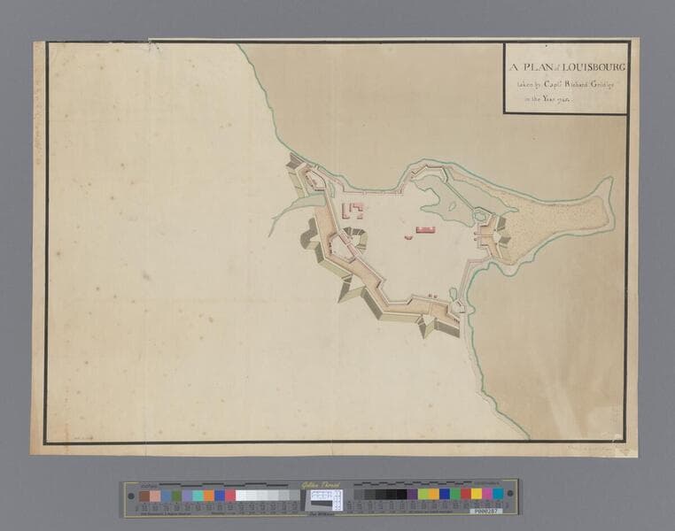 A manuscript copy, probably made around 1758. Shows detailed layout of the fortifications around Louisburg.