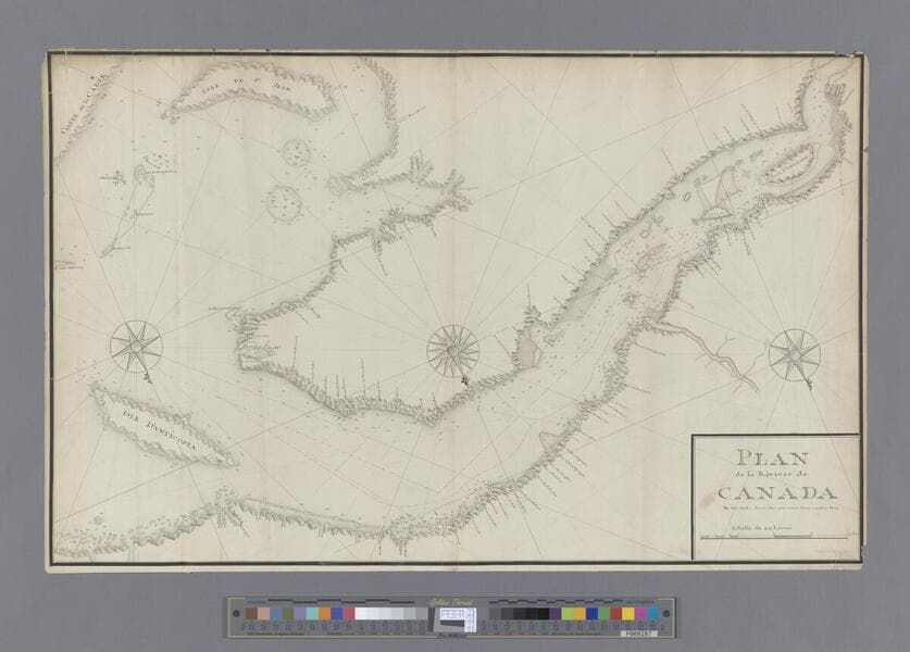 Manuscript chart of the St. Lawrence River from the Island of Anticosti to Québec, locating the mouths of rivers, capes and shoals. Documents the operations against Louisburg in 1756. Endorsed on back by Lord Loudon: "Plan of the River St. Lawrence from Sir Charles Hardy taken in a prize." A copy drawn by Samuel Holland, approximately 1757.