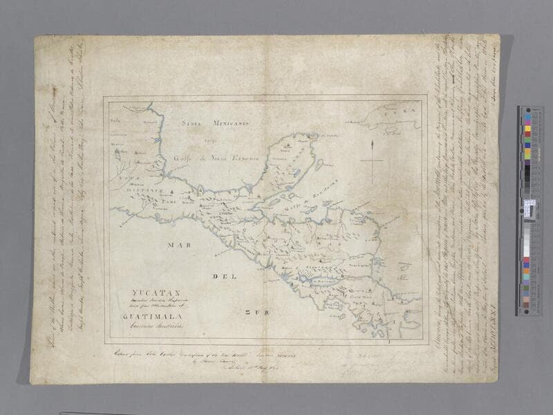 Manuscript map showing Yucatán, Belize, Guatamala, Honduras and the Mosquito Coast, El Salvador and the northern part of Nicaragua to Lake Nicaragua. Colored. The library also has a printed version of this map, call number 105:895 M., which includes all of Nicaragua, Costa Rica and Panama.