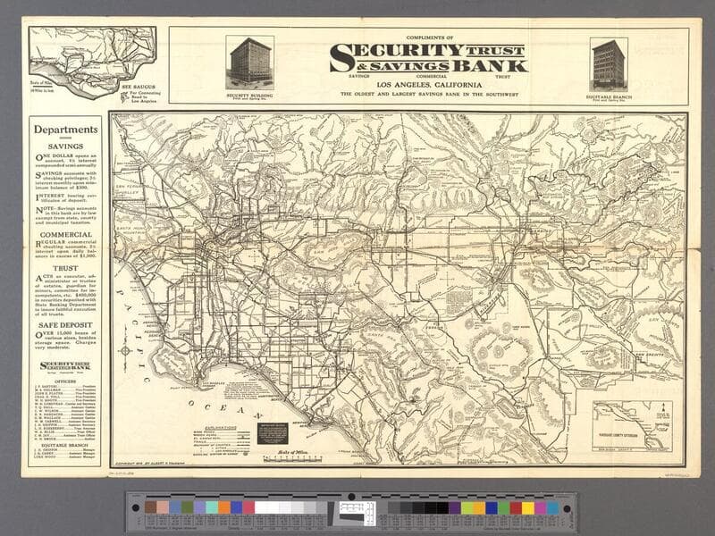 Old shelf number: eph J2d. This same map appears on the verso of several Los Angeles maps. At head of title: "Security Trust & Savings Bank." For earlier editions of this map, see RB ephMPCALIF0050 & ephMPCALIF0064; for a later edition, see RB ephMPCALIF0065; for another 1923 version, see RB 258713. Prime meridian: GM. Relief: no. Graphic Scale: Miles. Projection: Cylindrical. Printing Process: Lithography. Verso Text: MS note Eph J2d. Submaps: San Diego County; Ventura and Santa Barbara; Central California.