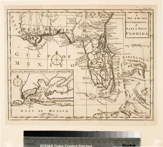 Kashnor notes, "Showing the coast south to Florida, and the territories north-west of Lake of the Woods and Louisiana. A scarce map issued during the Revolution." On distinctive blue-gray paper often used by Kitchin. Millar's Geography was rushed to print in 1775 at start of American Revolution. Tip of Florida shown in submap. Cartouche shows natives bowing to Britannia.. Prime meridian: London. Relief: pictorial. Graphic Scale: Miles. Projection: Pseudocylindrical. Printing Process: Copper engraving. Other Features: Sub-mapsCartouche. References: McCorkel 782.10. Verso Text: MS note: 116.