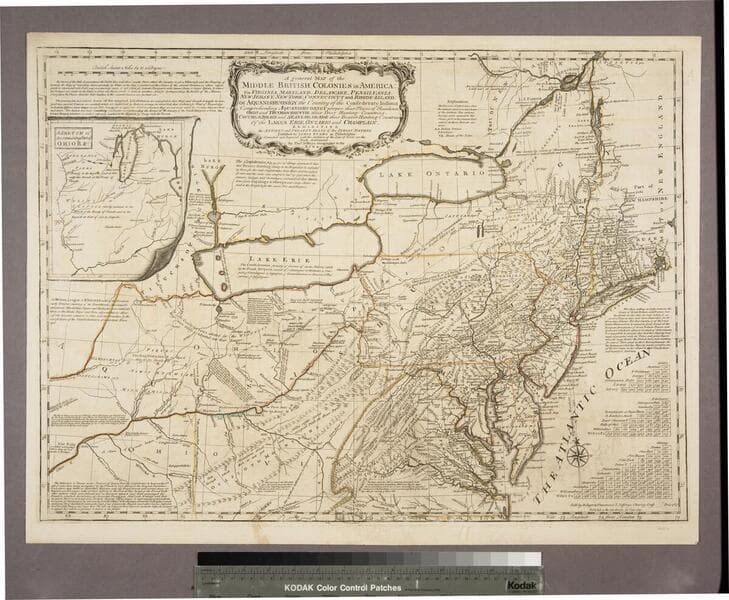 A general map of the middle British Colonies, in America : viz. Virginia, Maryland, Delaware, Pensilvania, New-Jersey, New-York, Connecticut and Rhode Island ; of Aquanishuonigy, the country of the Confederate Indians comprehending Aquanishuonigy proper, their places of residence, Ohio & Thuchsochruntie their deer-hunting countries, Couchsachrage and Skaniadarade, their beaver-hunting countries ; of the Lakes Erie, Ontario and Champlain ; exhibiting the antient & present seats of the Indian Nations / published by Lewis Evans at Philadelphia ; corrected and improved with the additions of the line of forts on the back settlements ; by Thos. Jefferys Geographer to the King