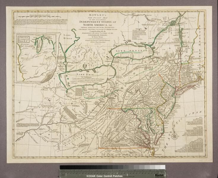 Bowles's new pocket map of the following Independent States of North America : viz. Virginia, Maryland, Delaware, Pensylvania, New Jersey, NewYork, Connecticut & Rhode Island ; comprending also the habitations & hunting countries of the Confederate Indians / by Lewis Evans. Printed for the proprietor Carington Bowles, No. 69 in St. Pauls Church Yard, London