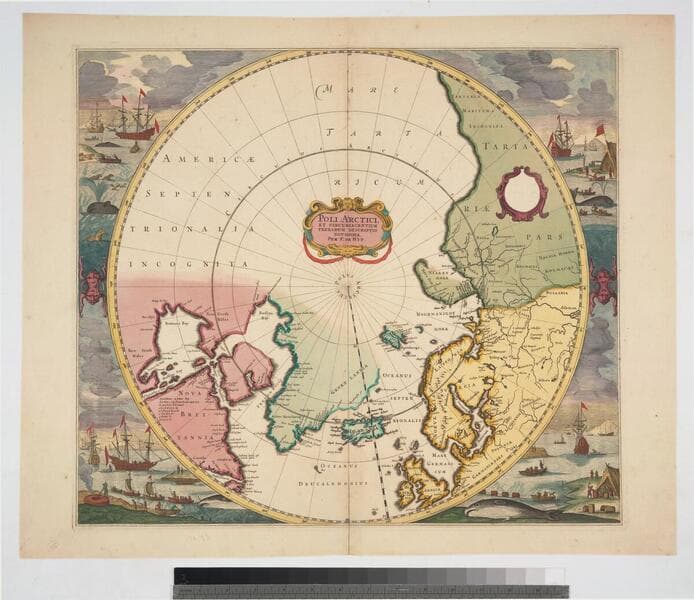 Kashnor notes, "A very rare map by Hondius, following the James' map, showing New Severn and Port Nelson." Empty dedicatory shield in Asia. Kashnor dates as ca. 1639. Burden identifies this as State 2 of this map, published in the 1636 English edition of Hondius's Atlantis novi (Burden no. 246). Relief: pictorial. Projection: Polar. Printing Process: Copper engraving. References: Van der Krogt, map 0020:1B. Verso Text: The Pole Arctique described (in English), Page 43 and 44.