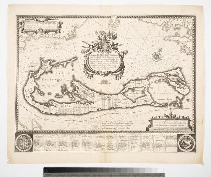 Mappa Aestivarum Insularum alias Bermudas dictarum : ad ostia Mexicani aestuarij iacentium in latitudine graduum 32: minutorum 25 ; ab Anglia, Londino scilicet versus libonotum 3300 miliaribus anglicanis ; et a Roanoack (qui locus est in Virginia) versus euro-notum 500 mil.; accurate descr