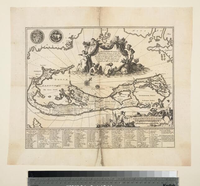 Kashnor notes, "At the foot is an extremely interesting list of settlers, divided into the various 'tribes.'" 'Nomina, fortunae bona submittentium in quaestus Virginiani alea Ao. 1622, quam fieri potuit accuratißime, expreßa numeris, eorum portiones quam proximè in agrorum divisione referentibus, quae potiones illic separatim distinguntur in regione ipsa, quemadmodum hic lineis ob oculos ponuntur.' A good deal of the property was held by Robert, Earl of Warwick, and the Earl of Devonshire." Kashnor dates as circa 1680. Date based on pagination as established by van der Krogt is 1631. Reference notes from Rosenthal. See 105:185 for a later version. Cartouche features Neptune with ship. Relief: no. Graphic Scale: Miles. Projection: Mercator. Printing Process: Copper engraving. References: Campbell, pl. 23; Palmer (Bermuda) p. 10; Van der Krogt, map 9660:2. Verso Text: Insulae Barmudas aliarumque adjacentium Descriptio. [Latin text describing island] MS notes: 99 104 184.