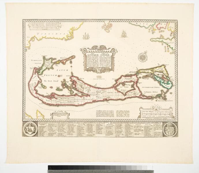 Mappa Aestivarum Insularum, alias Bermudas dictarum, ad Ostia Mexicani aestuarij jacentium in latitudine Graduum 32 Minutorum 25 Ab. Anglia, Londino Scilicet versus Libonotum 3300 Miliaribus Anglicanis, et a Roanoack (qui locus est in Virginia) versus euronotum 500 Mill. accurate descripta
