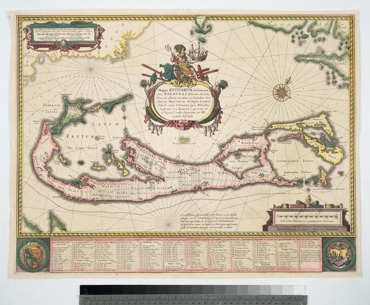Mappa Aestivarum Insularum, alias Bermudas dictarum, ad Ostia Mexicani aestuarij jacentium in latitudine Graduum 32 Minutorum 25 Ab. Anglia, Londino Scilicet versus Libonotum 3300 Miliaribus Anglicanis, et a Roanoack (qui locus est in Virginia) versus euronotum 500 Mill. accurate descripta
