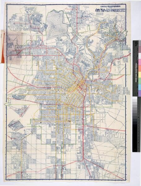 For earlier editions see RB 477326; 477767; 492439; for a map without the transportation system featured, see RB ephMPCALIF0068. Pacific Electric Co. lines are shown in red and routes named, other street car lines in yellow and are unnamed. City limits in green, map now centered on 12th Street & Main. Stamped: H. W. Stanton, 225 Laughlin Bldg. Los Angeles, Cal. Submaps: San Fernando Valley; Sawtelle; Palms. Relief: hachures. Projection: Plane. Printing Process: Lithography.