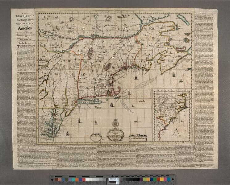 Reproduction. 1st state: Daniel's name appears in the cartouche. A lithographic reproduction of an old map, including the seal of the British Museum [Library] of 1897 on the original. Surround is a description of English colonies then existent. The paper used make has been printed with wire lines and watermark as might have been used on the original that can be seen from both sides of the paper. See 71000 for a reproduction of the 2nd state of this map, and 71005 for an original of the 2nd state. This copy has a British Museum Stamp. MS note: X70999. Prime meridian: London. Relief: pictorial. Graphic Scale: Miles. Projection: Pseudocylindrical. Watermark: Windmill. Printing Process: Lithography.