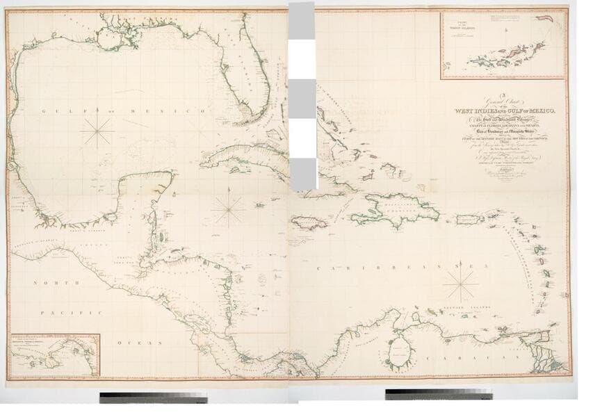Kashnor notes, "Shows a good coastline to present-day Texas." Submaps of the Virgin Islands and Panama. See also 093:719. Submaps: Chart of the Virgin Islands; Chart of the Coast of Biruquete, Panama, and Veragua, from Point Solano to Point Burica.. "describing the Gulf and Windward Passages, Coasts of Florida, Louisiana and Mexico, Bay of Honduras and Musquito Shore; likewise the Coast of the Spanish Main to the Mouths of the Orinoco. Drawn fro the Surveys taken by Mr. Geo. Gaulo and others. The New Spanish Charts, &c. and adjusted from recent Observations, J. Foss Dessiou, Master of the Royal Navy. Approved by the Chart Committee of the Admiralty." Prime meridian: London. Relief: no. Projection: Cylindrical. Printing Process: Copper engraving. Other Features: Sub-maps. Verso Text: MS notes: 796 4 sheets 19.