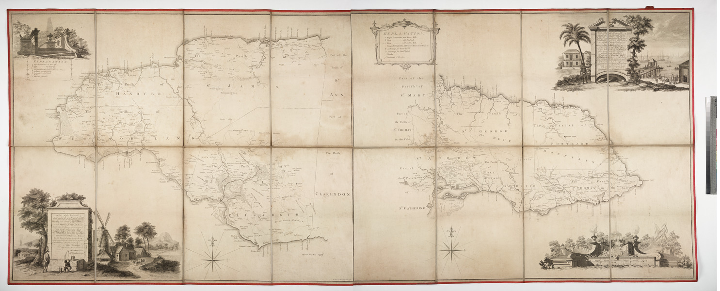 Cartouche: Elaborate harbor scene; Stair steps around scale. . Relief: no. Graphic Scale: Miles. Projection: Plane. Printing Process: Copper engraving. Other Features: Cartouche. Verso Text: Red ribbon, Label with MS note: Parish of St. George the Blue Portland St. Thomas in the East St. Andrew Port Royal St. David..