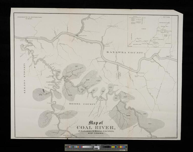 No old shelf mark. Three creeks run into the Kanawha River on the map: Armstrong Crk., Paint Crk., and Cabin Crk. (Jerry West?) Nice view of Coalburg lower left. Vignette: View of the Kanawha Hills from Coalburg. Prime meridian: GM. Relief: no. Graphic Scale: Poles (assumed to be rods). Projection: Cylindrical. Printing Process: Lithography.