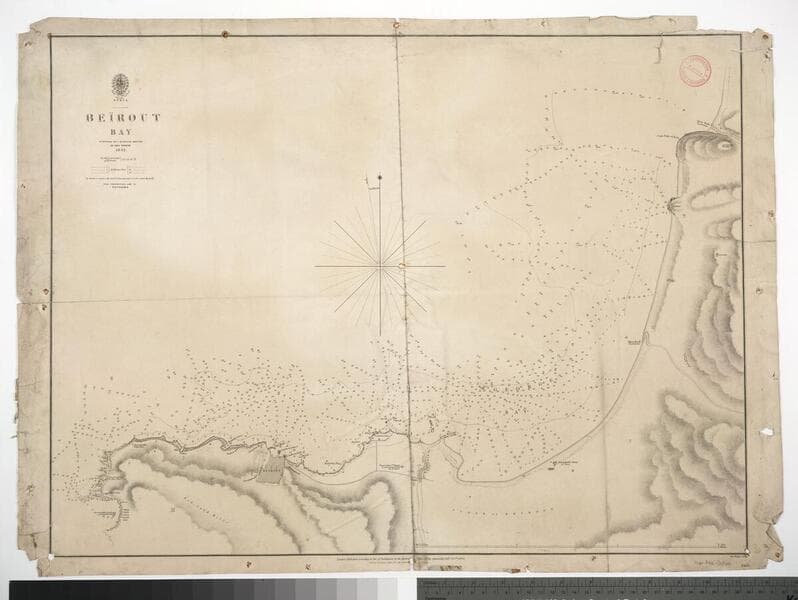 Kirkpatrick Catalogue entry: "2495 Mansell, A. L. Beirút, the antient Berytus, surveyed ... 1859. London, Admiralty, 1860. 1 sheet. [see cabinet]."At head of title: "Syria." Also shows depths in Saint George Bay and the coast of the Mediterranean adjacent to Beirut. For an 1842 edition of this map, see RB 623660. Vignette: View of Beirut from the Anchorage. MS notes: Burton (map cabinet) Mansell. Prime meridian: GM. Relief: hachures. Graphic Scale: Miles. Projection: Cylindrical. Printing Process: Lithography. Other Features: Vignettes.