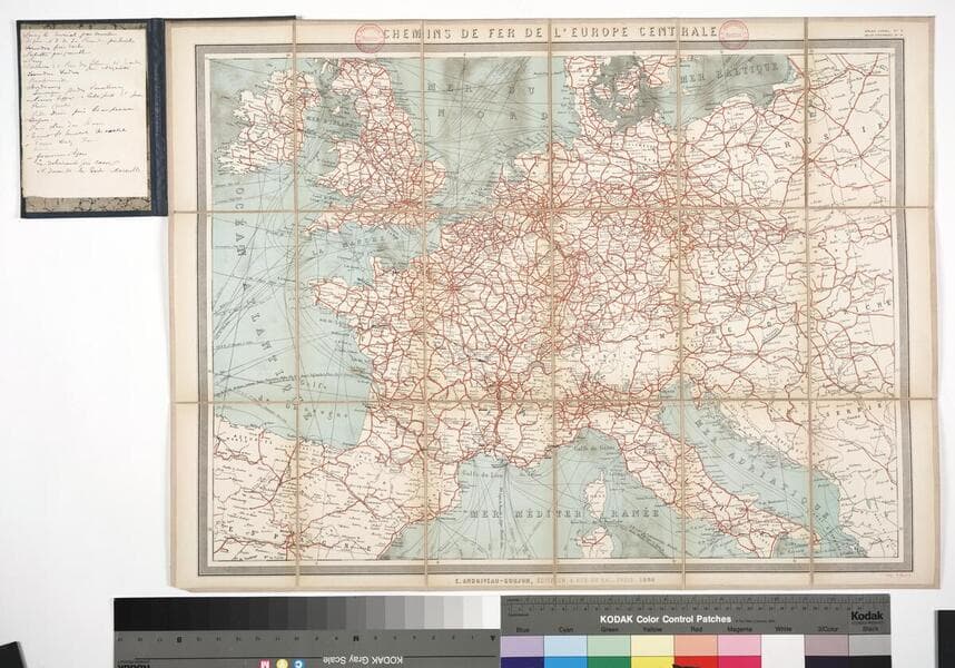 Kirkpatrick Catalogue entry: "2503 [Andriveau-Goujon] Navigation à vapeur dans le bassin del la Méditerranée et chemins de fer de l'Europe centrale. Paris, E. Andriveau-Goujou [sic]; London, Edward Stanford, 1868. 1 sheet. [see p.]."Sea routes traced in different colors indicating the nationality and type of ship operating. Verso has Stanford paste on labels. Clearly a French map, Stanford selling in the British market. Prime meridian: Paris. Relief: no. Graphic Scale: Miles, leagues. Projection: Polyconic. Printing Process: Lithography. Verso Text: Stamps: Kemsington Public Libraries. Standford labels..