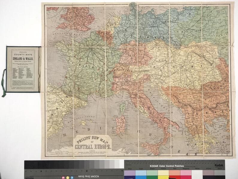 Kirkpatrick Catalogue entry: "2502 l Andriveau-Goujon, E., publisher. Chemins de fer de l'Europe centrale. Paris, 1884. 1 sheet. [see p.]."Places underlined, blue dots added, and some notes made, primarily in France. Numerous underlines and notes inside front cover. Seller's advertisement pasted to verso. Stamp: Kensington Public Libraries Sticker, cover: R.B. 10386 G.. Prime meridian: Paris. Relief: no. Projection: Polyconic. Printing Process: Lithography. Verso Text: Label: E . Andriveau - Goujon.