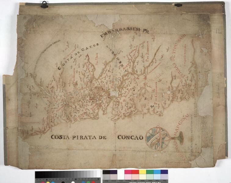Kirkpatrick Catalogue entry: "2476 Sao Paulo. Mappa da costa da Provincia de S. Paulo. 5 de abril de 1867. 1 sheet (manuscript). [see cabinet]." Unknown hand, not Burton's. Coast depicted with northwest at the top of the page. Cities, towns, and villages indicated in red ink, with distances between places given in black. Probably obtained while Burton was in South America between 1865 and 1868. MS notes: Burton (Map cabinet) Sao Paulo 2476. Relief: hachures. Projection: Plane. Printing Process: holographic.