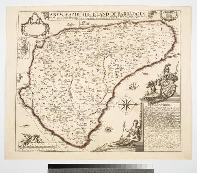 New Map of the Island of Barbadoes wherein every Parish, Plantation, Watermill, Windmill & Cattlemill is described with the name of the Present Possesor, and all things els remarkable according to a Late Exact Survey therof