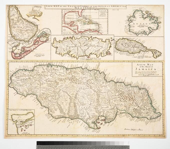 Kashnor notes, "Shows Carolina on the large map, and New England, Virginia and Carolina on the smaller map of the English Empire." This is four maps in one. The map of Jamaica is larger than the principal map. Two smaller maps show the English Empire, and a New Draught of Port Royal by Anthony Williams. Four maps on one sheet.. Prime meridian: London. Relief: pictorial. Graphic Scale: Miles. Projection: Mercator. Printing Process: Copper engraving. Other Features: Sub-maps. Verso Text: MS note: 322 SI.
