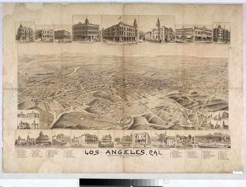 View looking north from the intersection of Main & Broadway. "Los Angeles gives it's name to the valley in which it is located, and where it occupies a charming location, nestling amidst orange groves and vineyards. The Coast Range with it's accompanying valleys here form a panoramic view of rare beauty." Sticker: BV/ S-2. Sticker: BV/ S-2. Prime meridian: GM. Projection: Birds-eye view. Printing Process: Lithography. Verso Text: MS note: 564/5a.