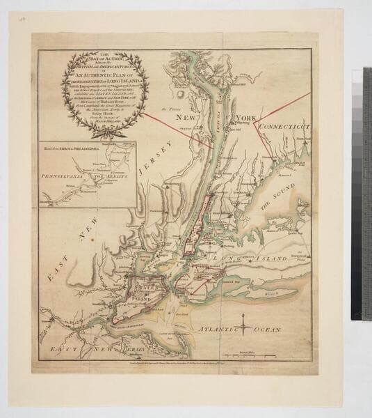 The seat of action between the British and American forces or an authentic plan of the western part of Long Island with the engagement of the 27th. August 1776. between the King's Forces and the Americans: containing also Staten Island, and the environs of Amboy and New York, with the course of Hudsons River, from Courtland the Great Magazine of the American Army, to Sand Hook / from the surveys of Major Holland