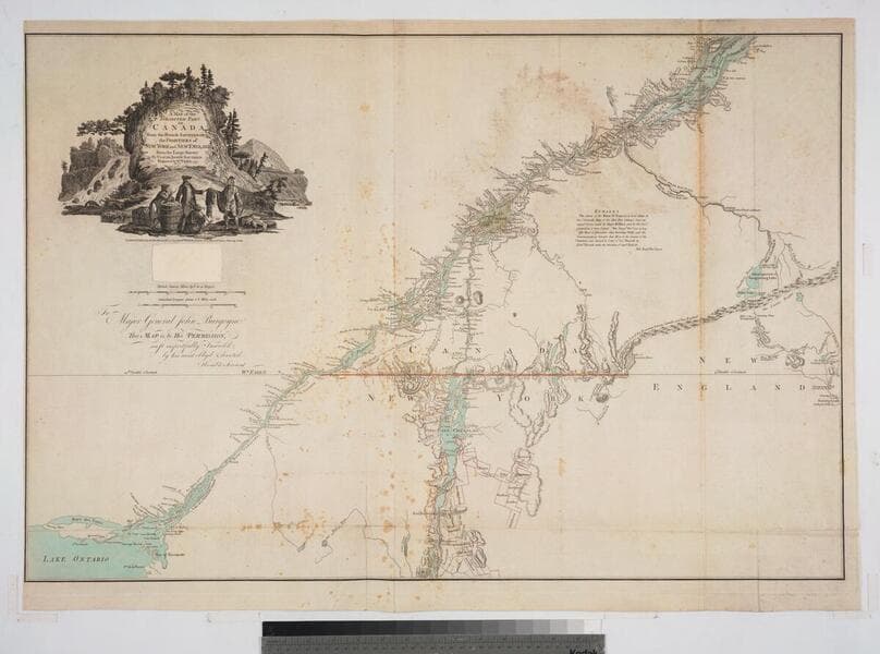 Kashnor notes, " With engraved locations of the 'Winter Quarters of the King's Army in Canada, 1776' and shoWing the old locations of the land grants around Lake Champlain and doWn to Lake George, made after the Old French War, a very rare map." see 105-305M for a variant copy. Elaborate cartouche of traders dealing With Indians for pelts. Includes "Winter quarters of the King's Army in Canada, 1776.". Relief: pictorial & hachures. Graphic Scale: Miles, statute, leagues, Canadian. Projection: Cylindrical. Watermark: J WHATMAN. Printing Process: Copper engraving. Other Features: Cartouche. References: McCorkle 777.19. Verso Text: MS note: 72.