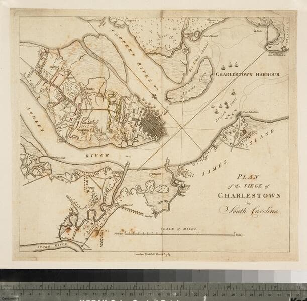 Kashnor notes, " A rare plan, showing the Siege of Charleston, under command of Clinton and Admiral Arbuthnot, from 11 Feb. to 10 May, 1780, giving the movement of the troops from Edisto Inlet, the march to James Island, and the subsequent operations at Charlestown Neck." Kashnor dates as [1780]. Chronological description of movement of British Forces and emplacements of defenders. Keyed box lower right corner of map. . Relief: pictorial & hachures. Graphic Scale: Miles. Projection: Plane. Watermark: J B. Printing Process: Copper engraving.