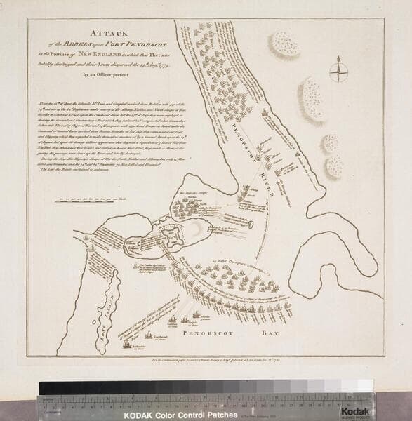 Attack of the Rebels upon Fort Penobscott in the Province of New England in which their Fleet was totally destroyed and their Army dispersed the 14th. Augst. 1779. For the Continuation (after Tindal's) of Rapin's History of Egd. Published as the Act directs Decr. 18th 1785. by an Officer present