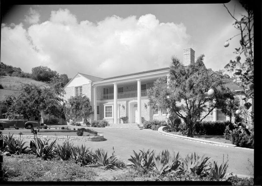 House interiors and exteriors. The house is styled after a Mexican hacienda with archways and features tapestries and Mexican–style furnishings.