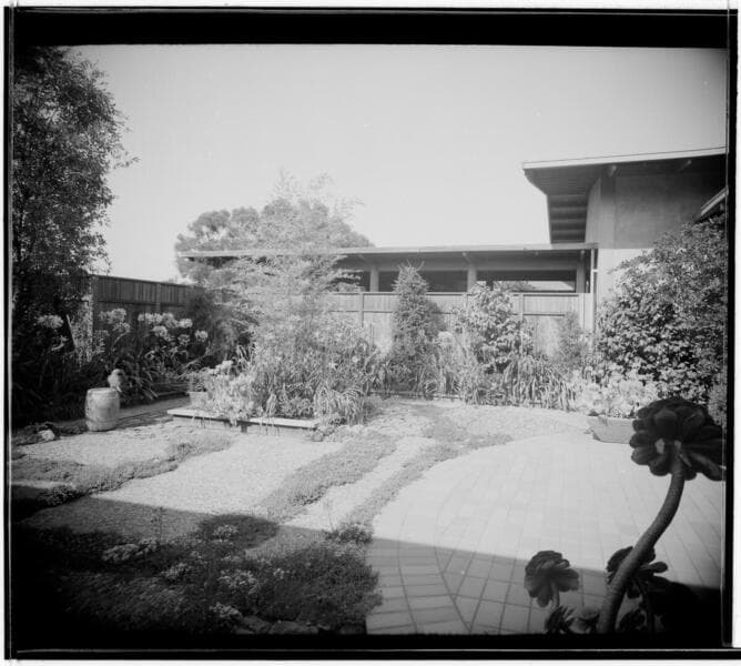 Interior and garden photographs of a house including an atrium or courtyard garden.