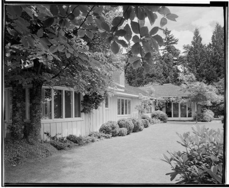 Exterior and interior views of a small adobe ranch house with mission tile roof.