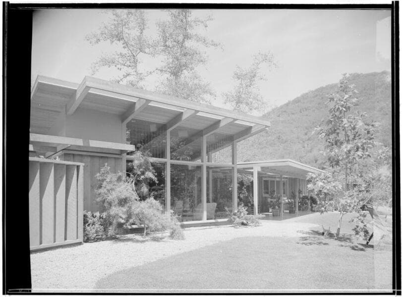 Exterior and interior views of a postwar house featuring extensive floor–to–ceiling glass, built–in storage and carport.