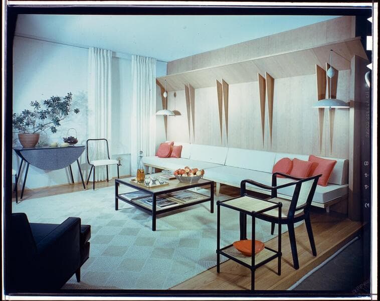 Images of the George Nakashima dining room, bedroom-dressing room suite, living room, music room, den, dining room with enamel, and hi-fi room. Taken for, or featuring lighting designed by, Rudolph Wendel, Inc.
