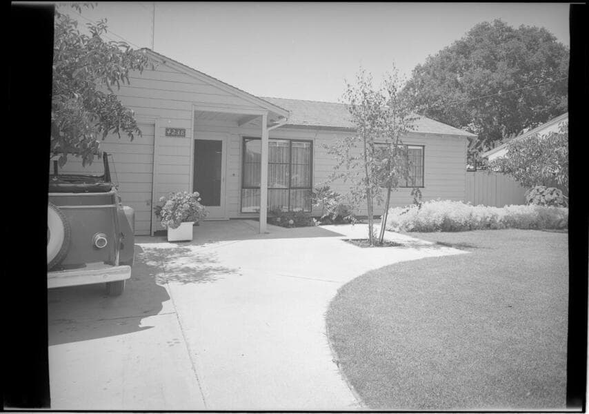 Interior and exterior views of a house, especially of its landscaping. Includes images of the carport and front entry, patios, and planters.